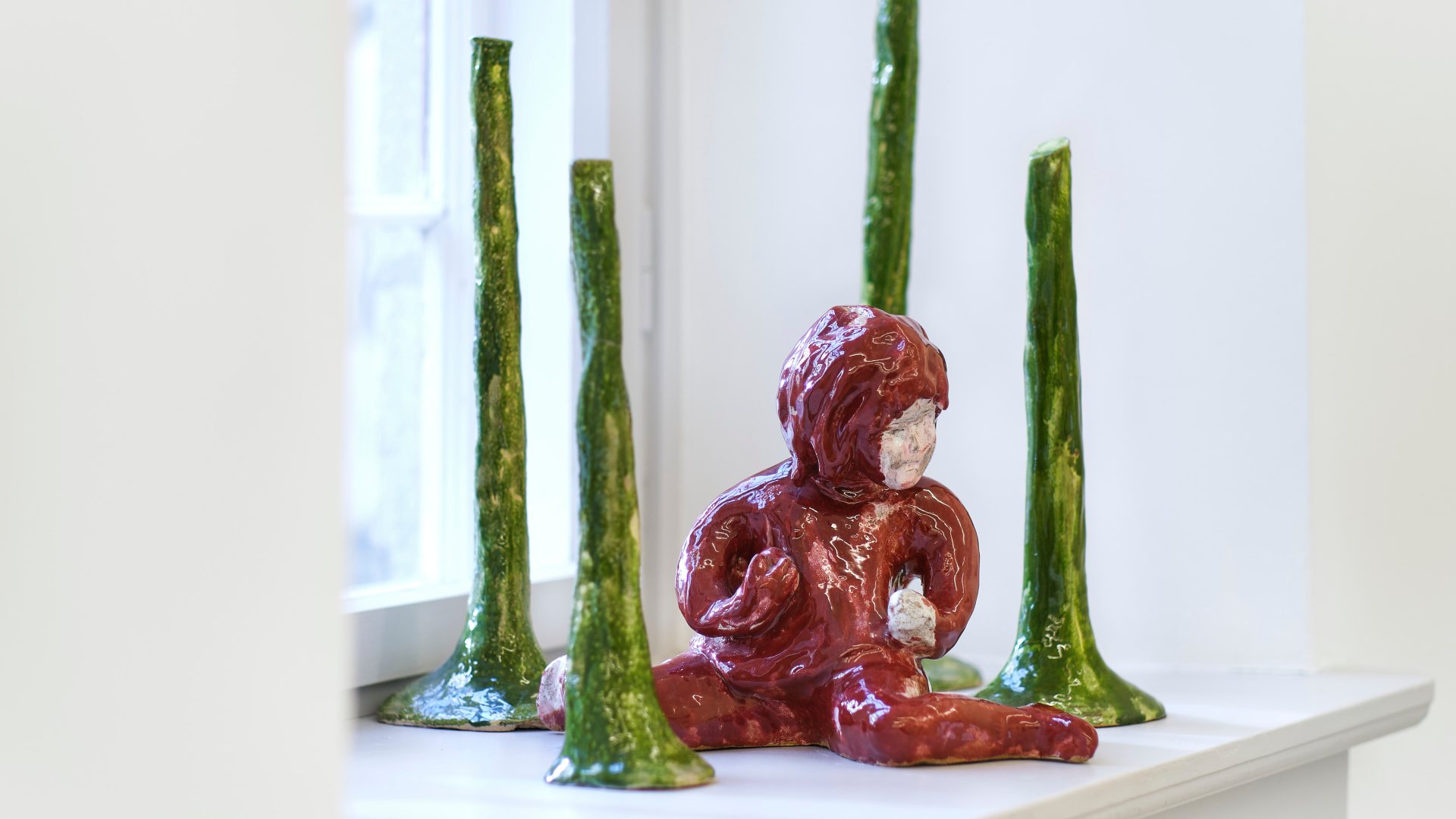 besteht aus Gemälden und Keramikskulpturen, die zusammen ein düsteres